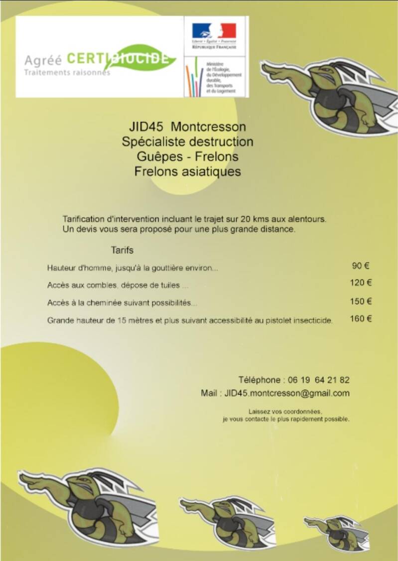 JID 45.MONTCRESSON est une entreprise spécialisée dans la destruction des nids de frelons asiatiques et frelons européens ainsi que les nids de guêpes. Notre objectif est d'offrir des solutions efficaces et durables pour protéger nos clients contre les nuisibles. Notre équipe est formée et expérimentée, garantissant un service professionnel et des résultats satisfaisants.